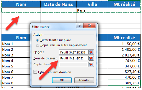 Dans l’exemple suivant, tapez Paris sous Ville et tapez >1000 sous Mt réalisé mais sur la deuxième ligne de la zone de critère :